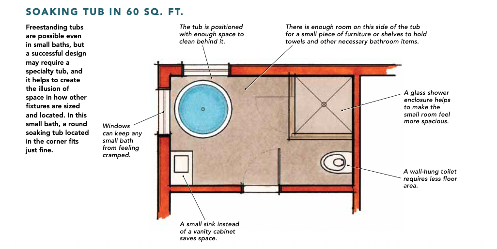 When it comes to room size and dimensions, about 110 sq. ft. is optimal for a 60-in.-long to 72-in.-long tub and a separate shower. A 9-ft. by 12-ft. or 8-ft. by 14-ft. room, for example, would work just fine. A smaller bathroom, even one that’s 60 sq. ft., will still work if you use a slipper tub or a small Asian-style soaking tub. Soaking tubs are usually round or square, and they are deep enough that you can be almost entirely submerged when seated. A 40-sq.-ft. Bathroom (commonly 8 ft. by 5 ft.) is usually best served by a soaking tub and small shower, or you can forgo the separate shower and use a small tub only.